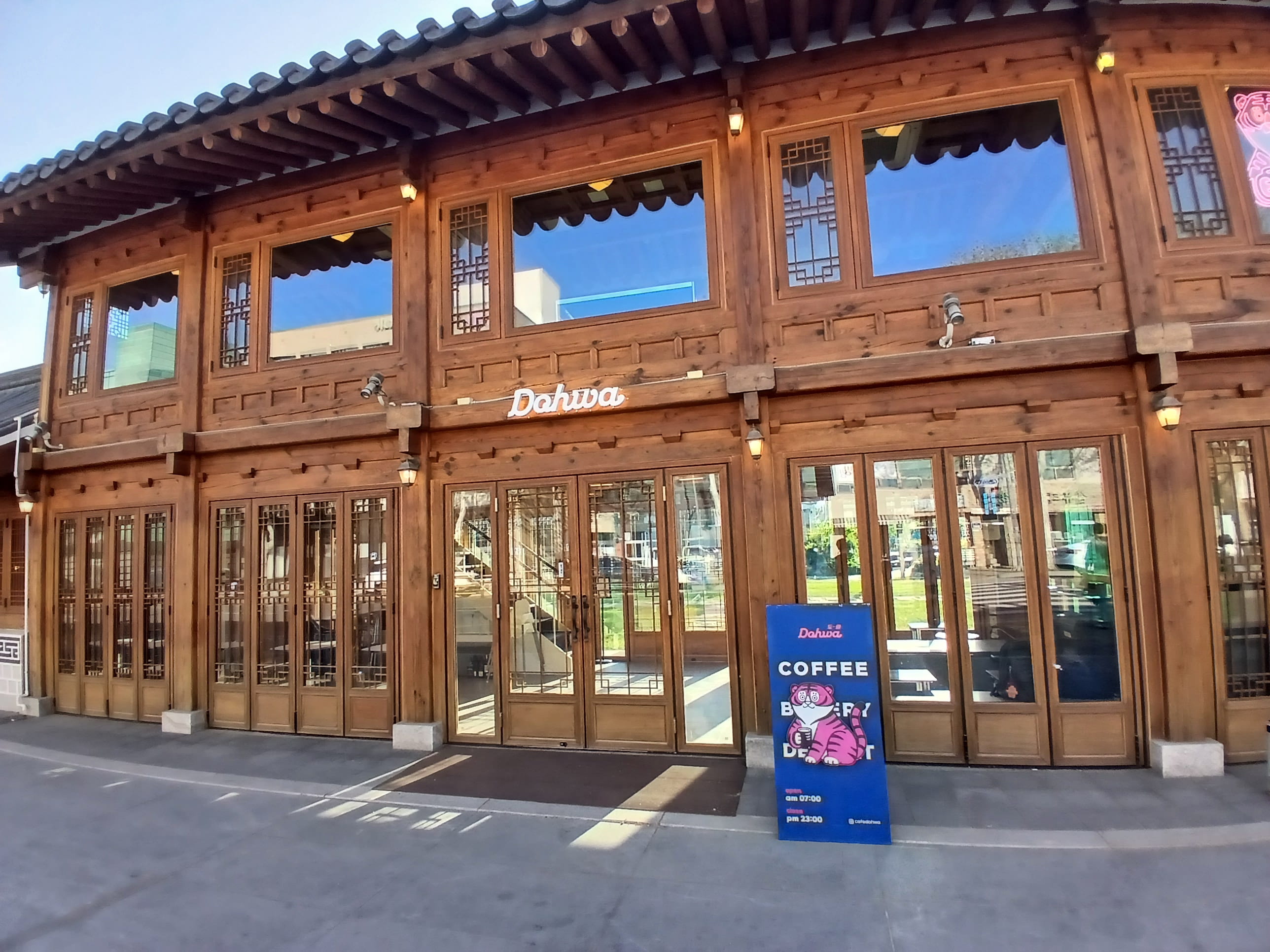 마당 한가운데에서 위를 올려다보면 처마 라인이 길게 이어진다. 바로 앞이 도로라 사람도 많고 차도 계속 지나다니는데, 안쪽으로 들어오면 그 소리가 완전히 사라지진 않아도 확실히 덜 직접적으로 들린다.